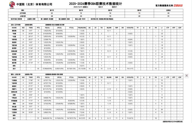2025-2026賽季CBA常規(guī)賽第九輪,遼寧本鋼對陣上海久事的比賽于31日晚在遼寧體育館進行。遼寧本鋼在整場比賽中被對手全面壓制,最終在主場以65:91完敗給上海久事。